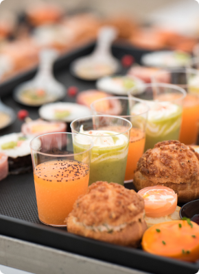 Verrines traditionnelles ou innovantes, mignardises, viandes, brochettes de viande ou de légumes, créations originales donnent un éclat unique à vos envies.